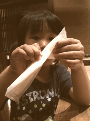 まだ鳴らしてないおしぼりを持って